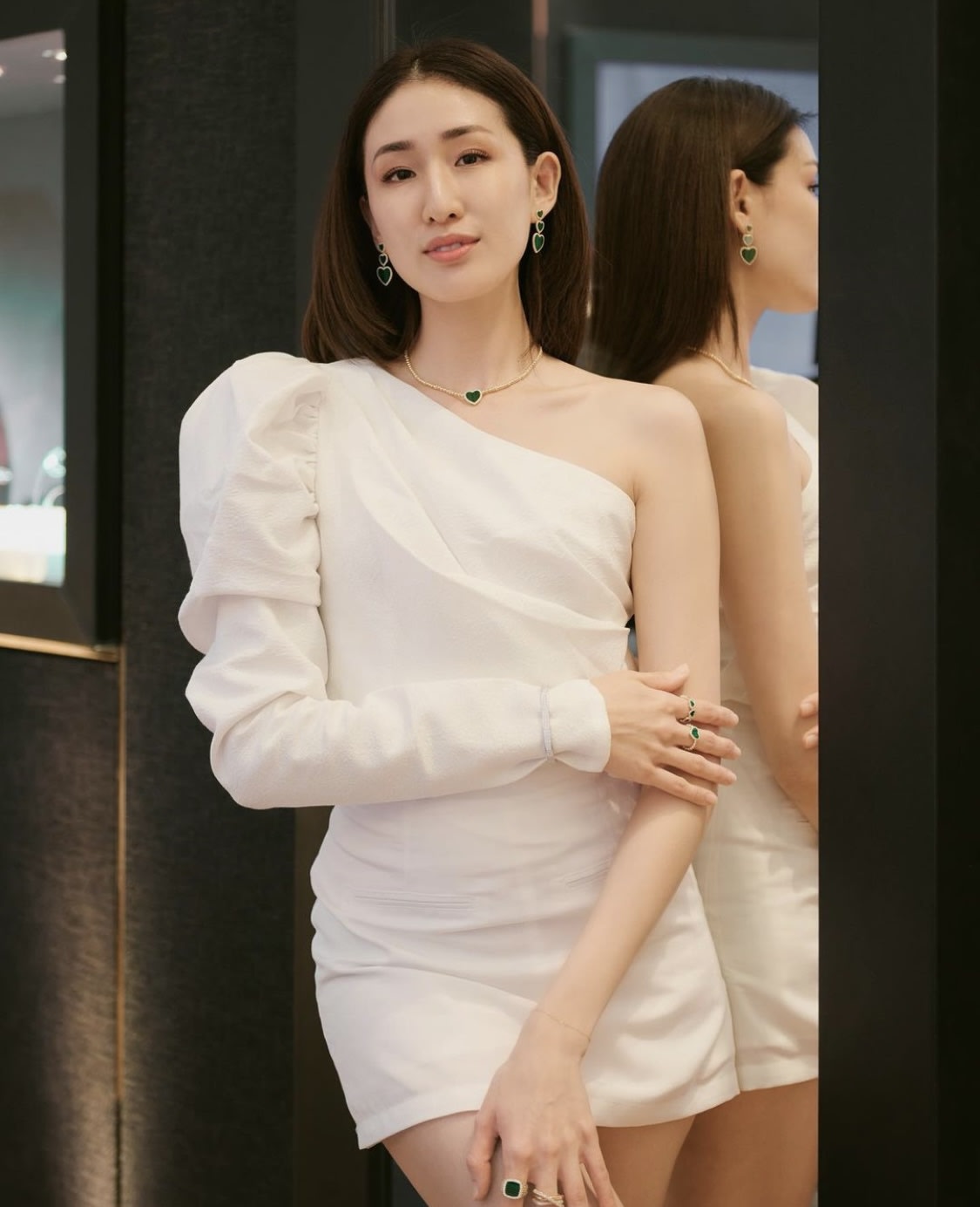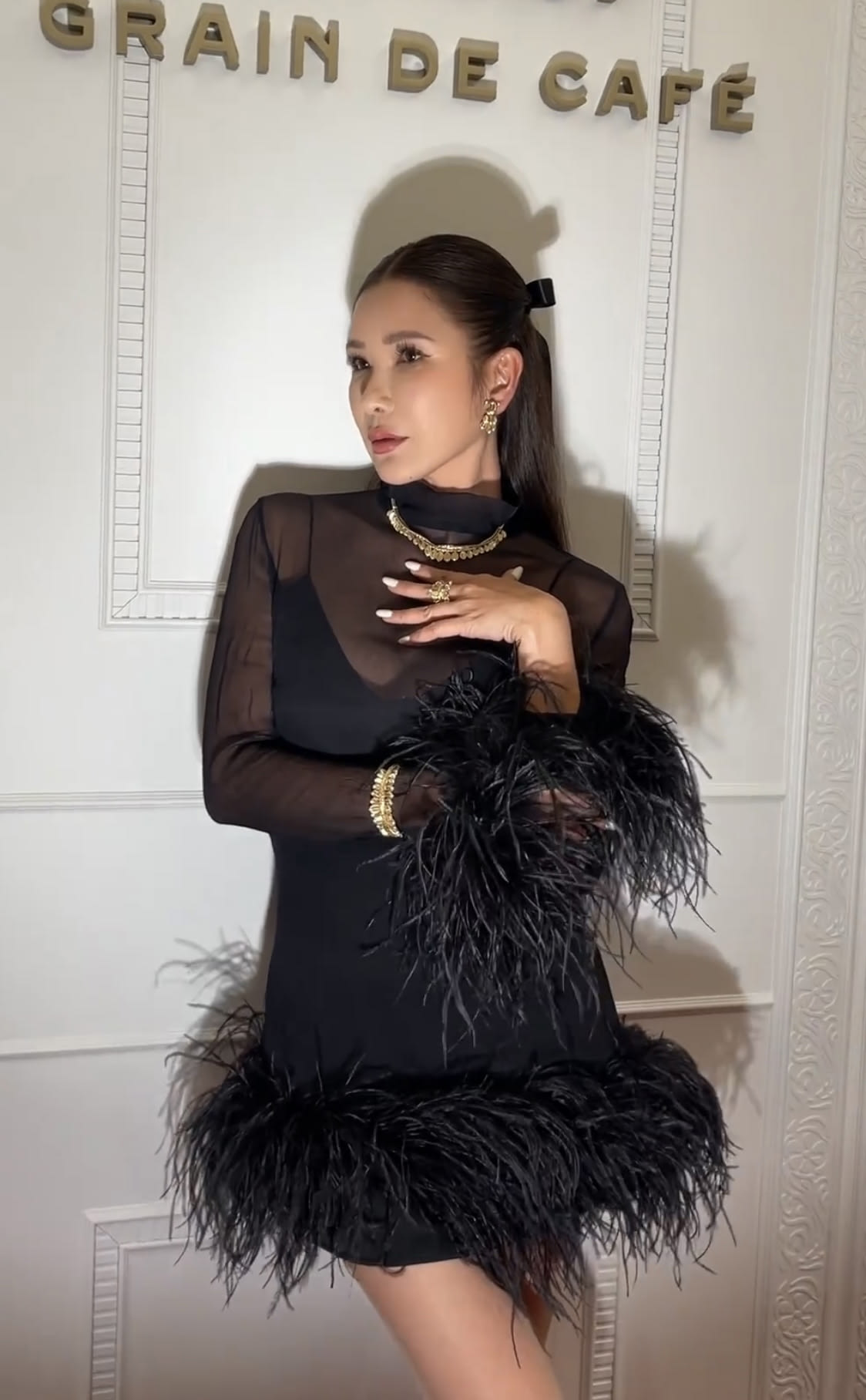Socialite Jamie Chua brought on the drama in a chic feathered mini, which she accessorised with lots of bling from Cartier’s new collection.