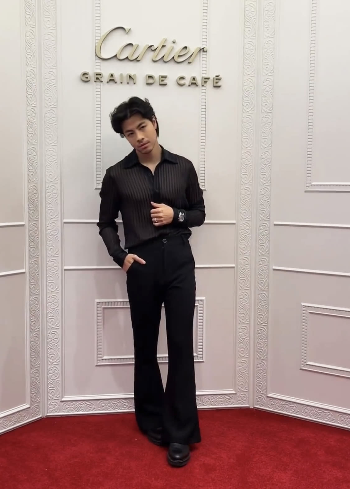 If there’s any dude who can make bell bottoms look cool, it’s Ben. He paired it with a black sheer shirt for a laid back yet pulled together look.