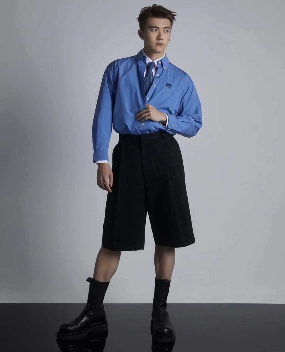 Part preppy, part professional, Zetong looked like a dashing overgrown school boy in this contrasting Miu Miu ensemble.