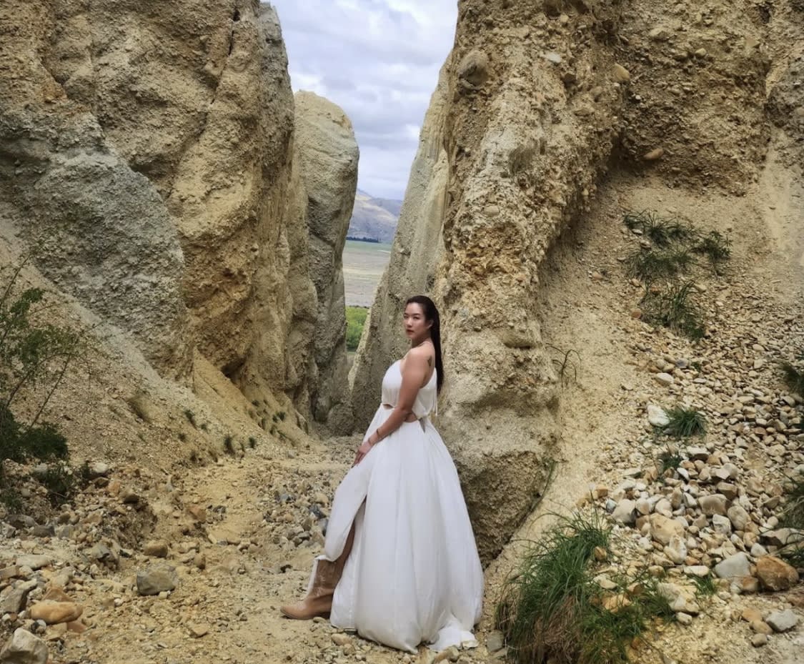 So gorgeous and goddess-like is Rui En in this white voluminous cutout number. The tan boots and shoulder tattoo add some edge to the otherwise girly look.