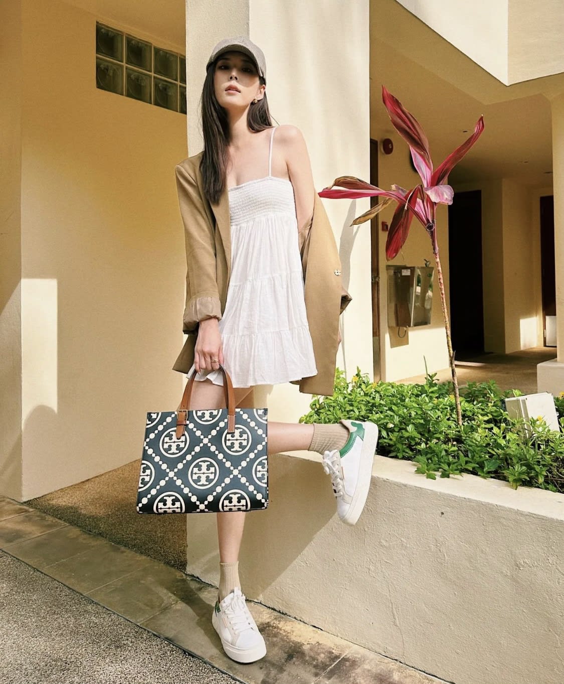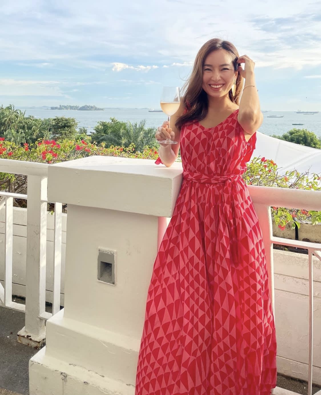 You Yi kicked off the long weekend in style in a breezy red geometric print dress and a drink in hand. That megawatt smile is her best accessory.