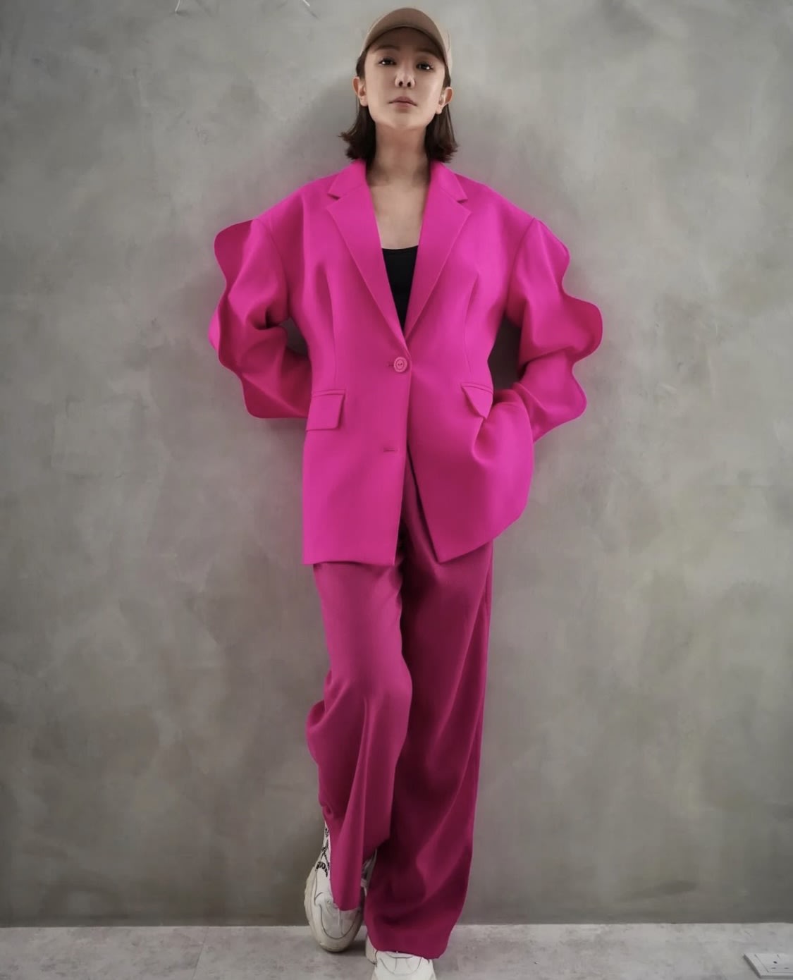 Bingyu upped the ante by opting for a statement pink suit, featuring scalloped sleeves. Love!