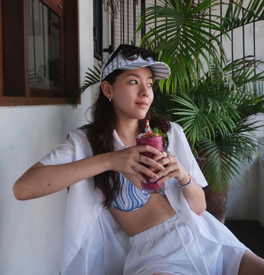 This snap of Jasmine chilling in a white and blue beach-ready ensemble with a drink in hand is giving us serious vacay envy.