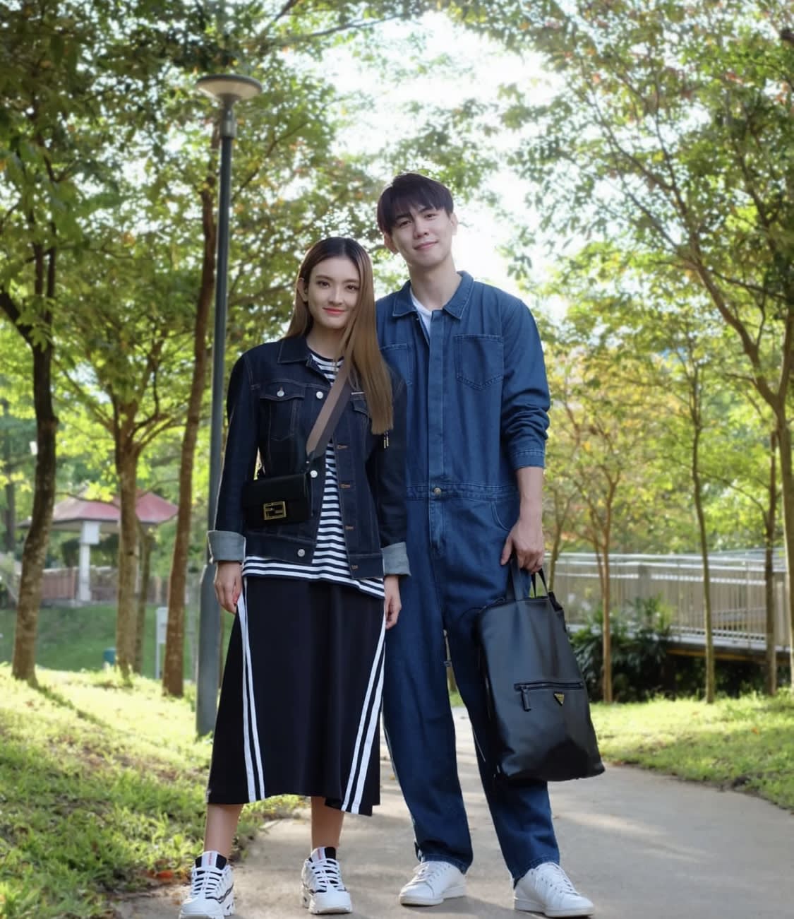 Couple dressing, when done right, can look chic. Hong Ling and Nick nailed it by matching different shades of blue and going for failsafe separates. They even have matching smiles. Cute.