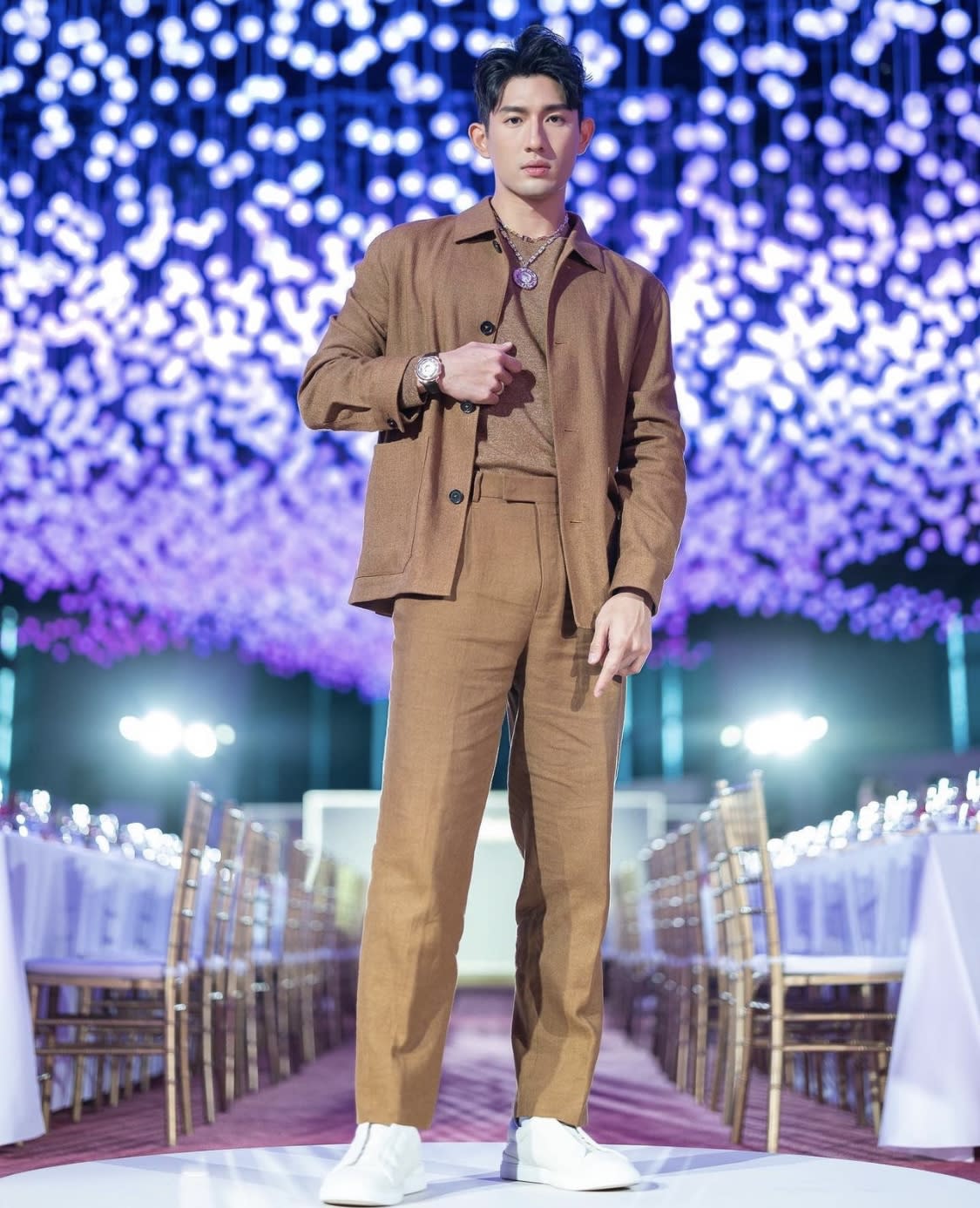 Ayden cut a dashing figure in a tan suit and white kicks. His blingy necklace and watch are the icing on the cake.