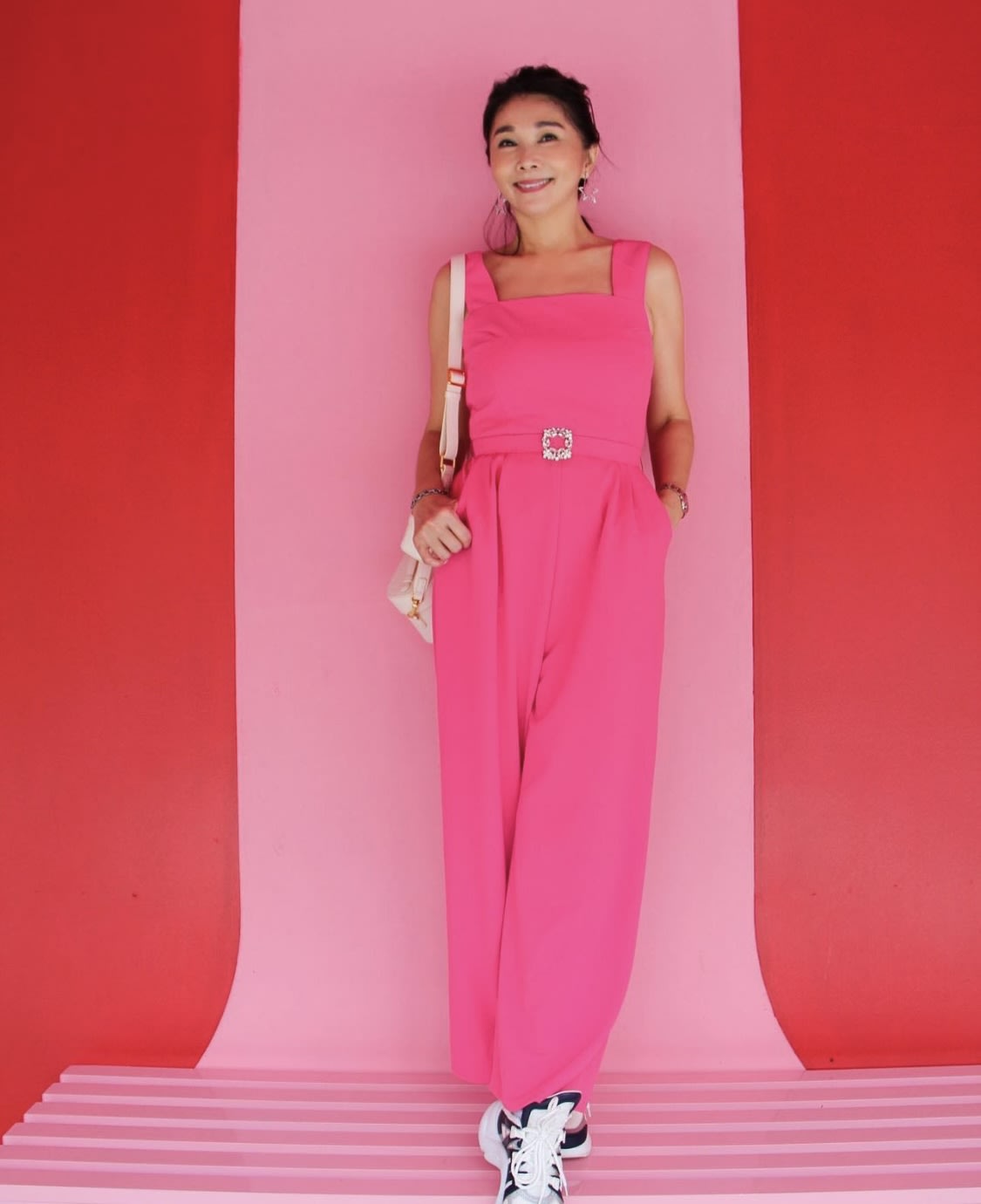 Is there such a thing as too much pink? We’re assuming it’s a no for Xiuhuan, who embraced the Barbiecore trend with a chic bubblegum pink jumpsuit (love the crystal statement buckle) and matching background.