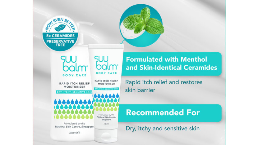 Formulated at Singapore’s National Skin Centre, the preservative-free Suu Balm body moisturiser uses menthol to calm itchiness. Meanwhile, five types of ceramides repair the skin barrier as corn extract bolsters hydration levels. It also has a lightweight texture made for the local climate.