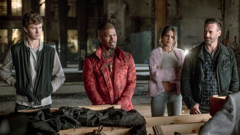 Let’s go to work: Ansel Elgort, Jamie Foxx, Eiza Gonzales and Jon Hamm prepare to rock out.