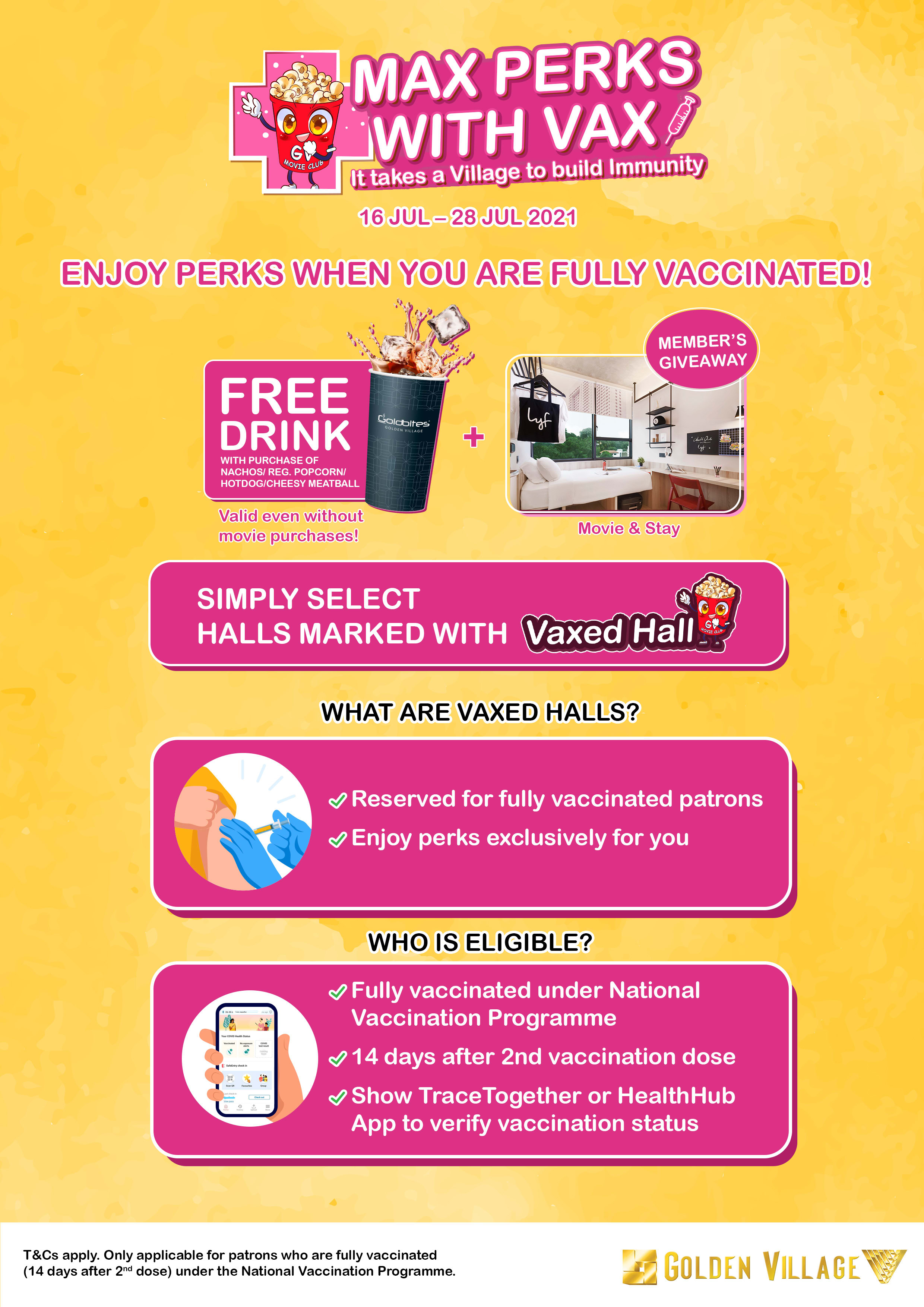 To encourage more public members to get vaccinated, Golden Village is launching a ‘Max Perks with Vax’ promotion, as well as Vaxed Halls, halls catered specifically to fully vaccinated patrons, the cinema operator said in a press release Friday (July 16).