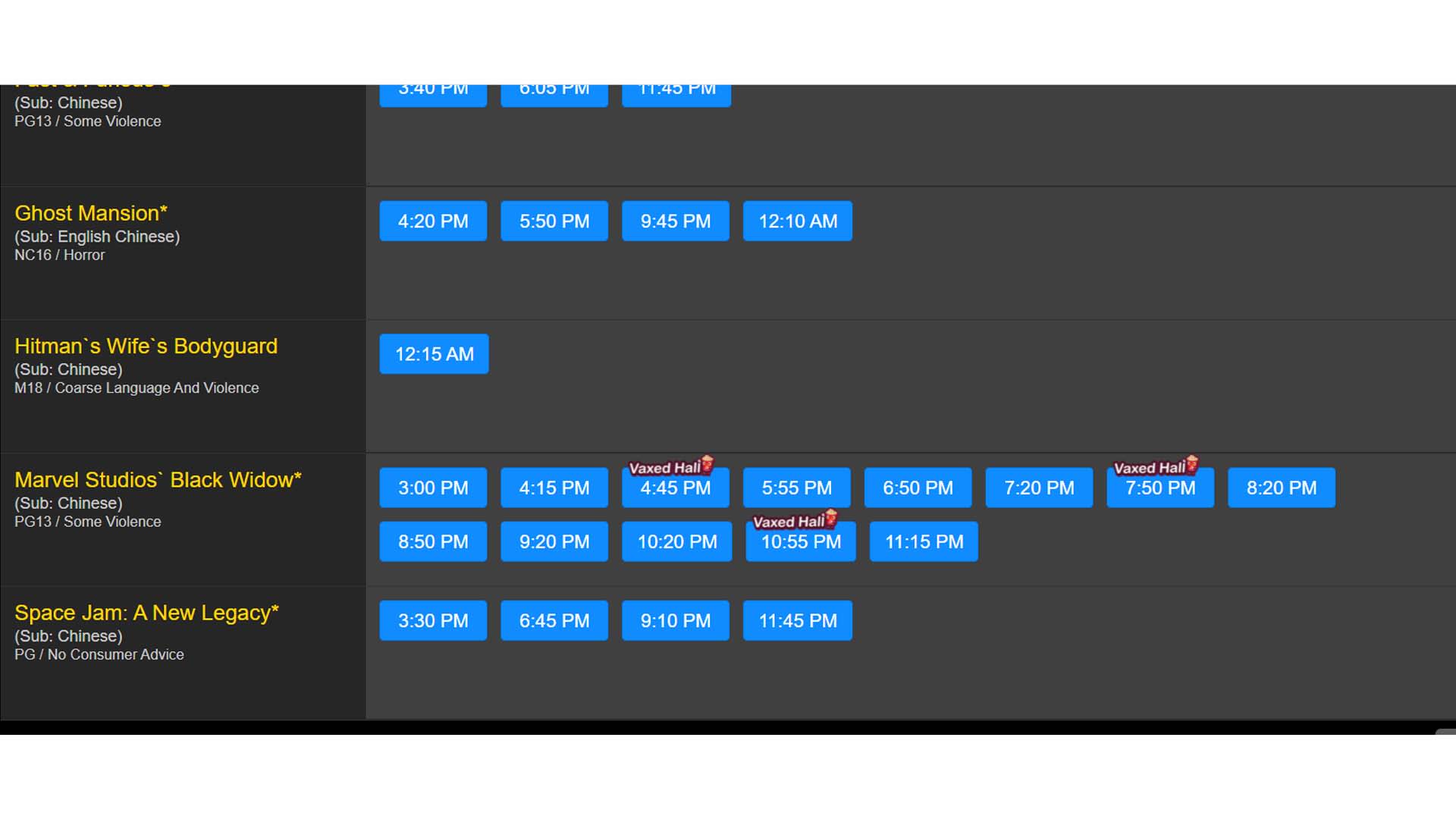 How to buy Vaxed Hall tix: This is GV Paya Lebar's showtime schedule for Friday (July 16); just click the slot with the ‘Vaxed Hall’ icon.