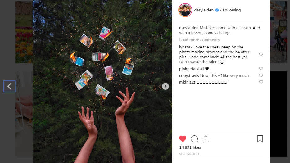 I didn’t want to come back until I thought of something good enough to post. I didn’t want my first post to be, ‘Oh look, guys, I’m in Iceland right now’. That’s just not going to cut it. I wanted something more raw, but still visually stunning. I told myself to just wait till I had something. Honestly, I dreamt of my comeback photo (below). I woke up and decided, okay this is what I’m going to do. I even drew it out in case I forgot. [Takes out phone to show a photo of his arm outstretched, and colourful doodling around it] I thought it was a very strong message. That was my past and I want to erase it, not because I want to run away from it, but because I want to change. I don’t want my past to define who I am. I want the new me to define who I am. I’ll make extra effort to appreciate people around me and the support I have even more. There was no pressure [when I had to come back] so I just waited. And this image felt right. I printed all those infamous photos on Polaroids and burn it. Just address the issue head on.