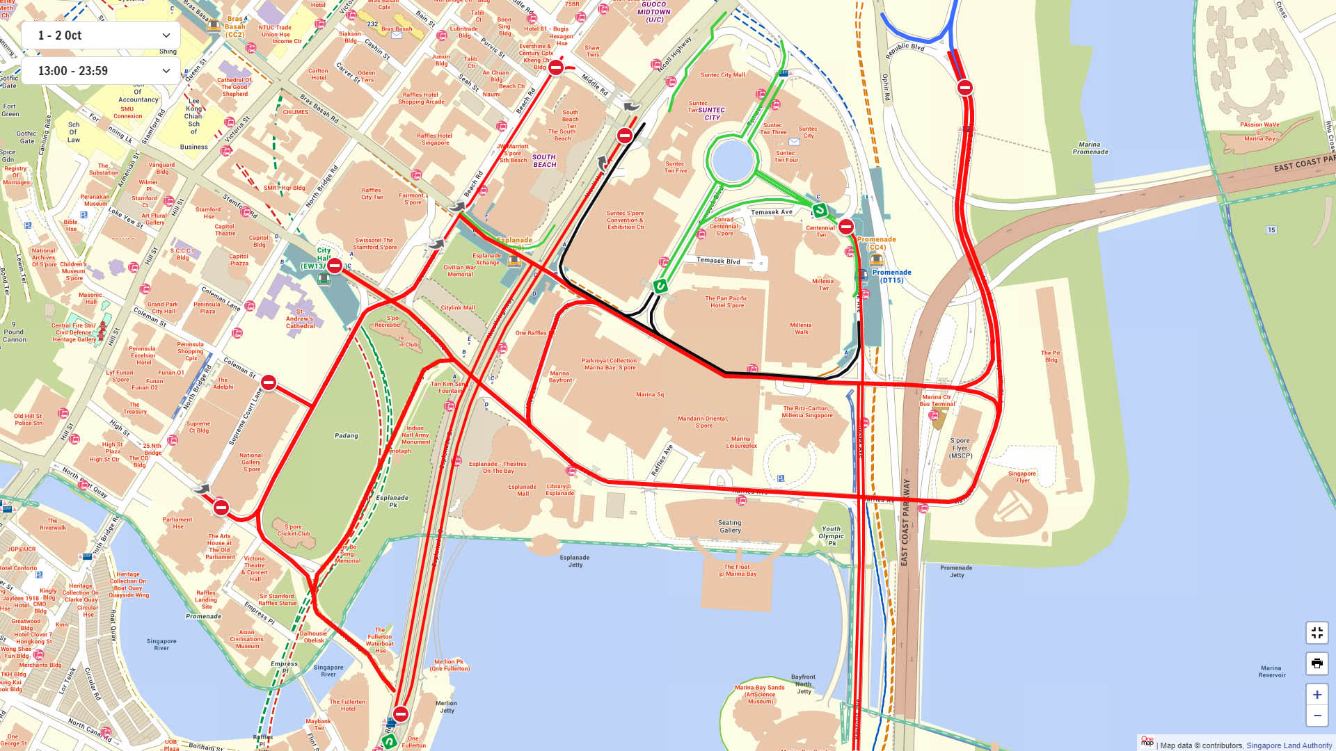 The above map shows the full extent of road closures, as will be the case on Oct 1-2 from 1pm to 11.59pm. Road closures will vary over certain time periods from Sep 28 to Oct 4. There are interactive maps detailing the road closures at various times here.